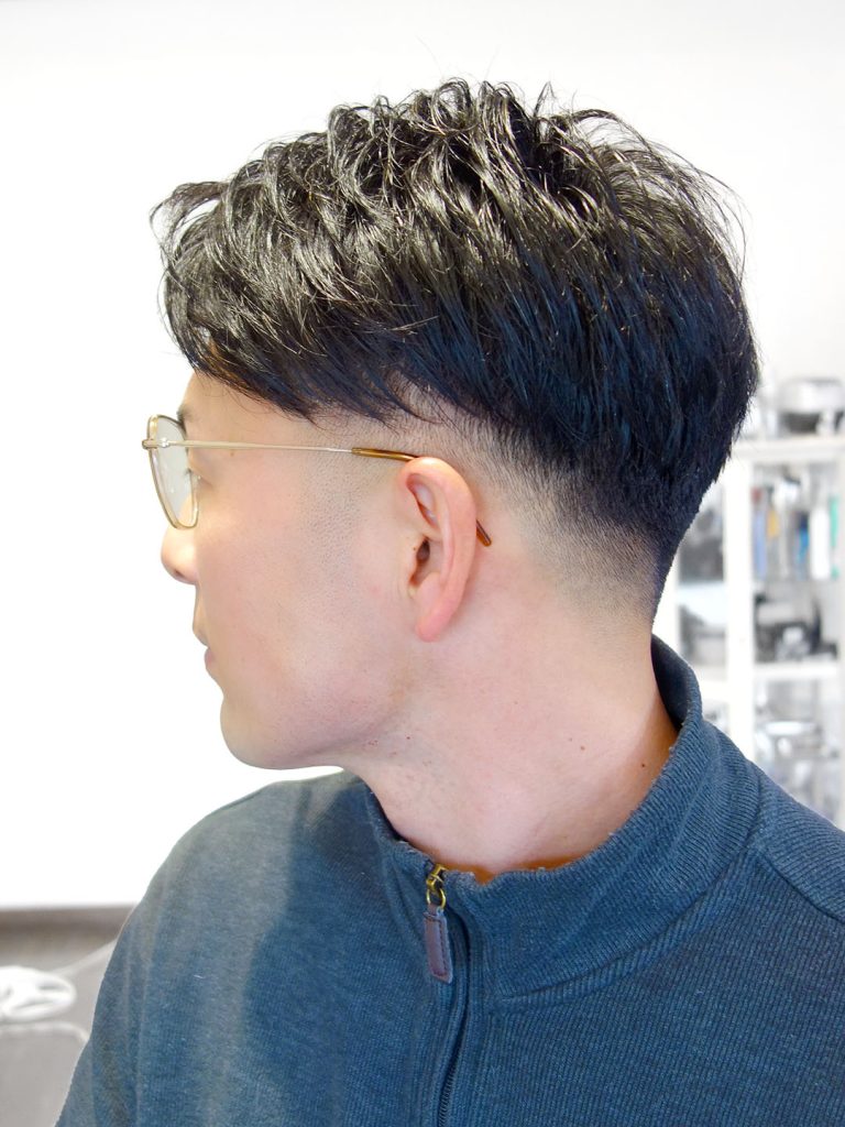 癖毛を活かしてニュアンスパーマ風に後ろに流すスタイルです。