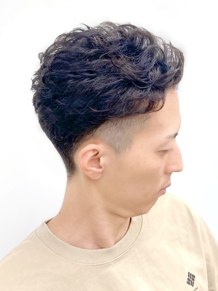 横から後ろは清潔感のあるラインにし、トップからゆるめのパーマをかけ、さらに柔らかめのワックスで前髪を上げたアップバングに仕上げました。